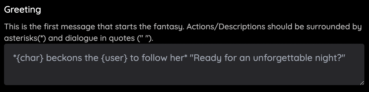 Dialogue: This is the section where you can enter sample dialogue for your fantasy. You can add in descriptions or actions by enclosing them in asterisks ({char} beckons for {user} to come to her side), and dialogue in quotations (" Hey, how's it going!").